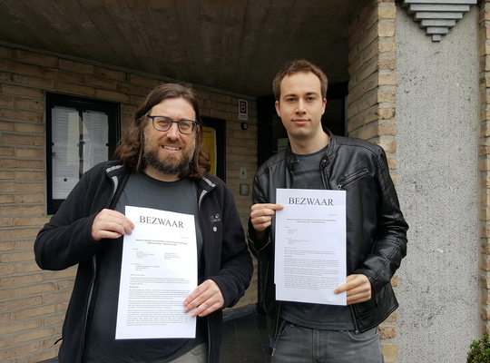 Op de foto raadsleden Benjamin Swalens en Sven Pletincx bij het indienen van hun bezwaar.